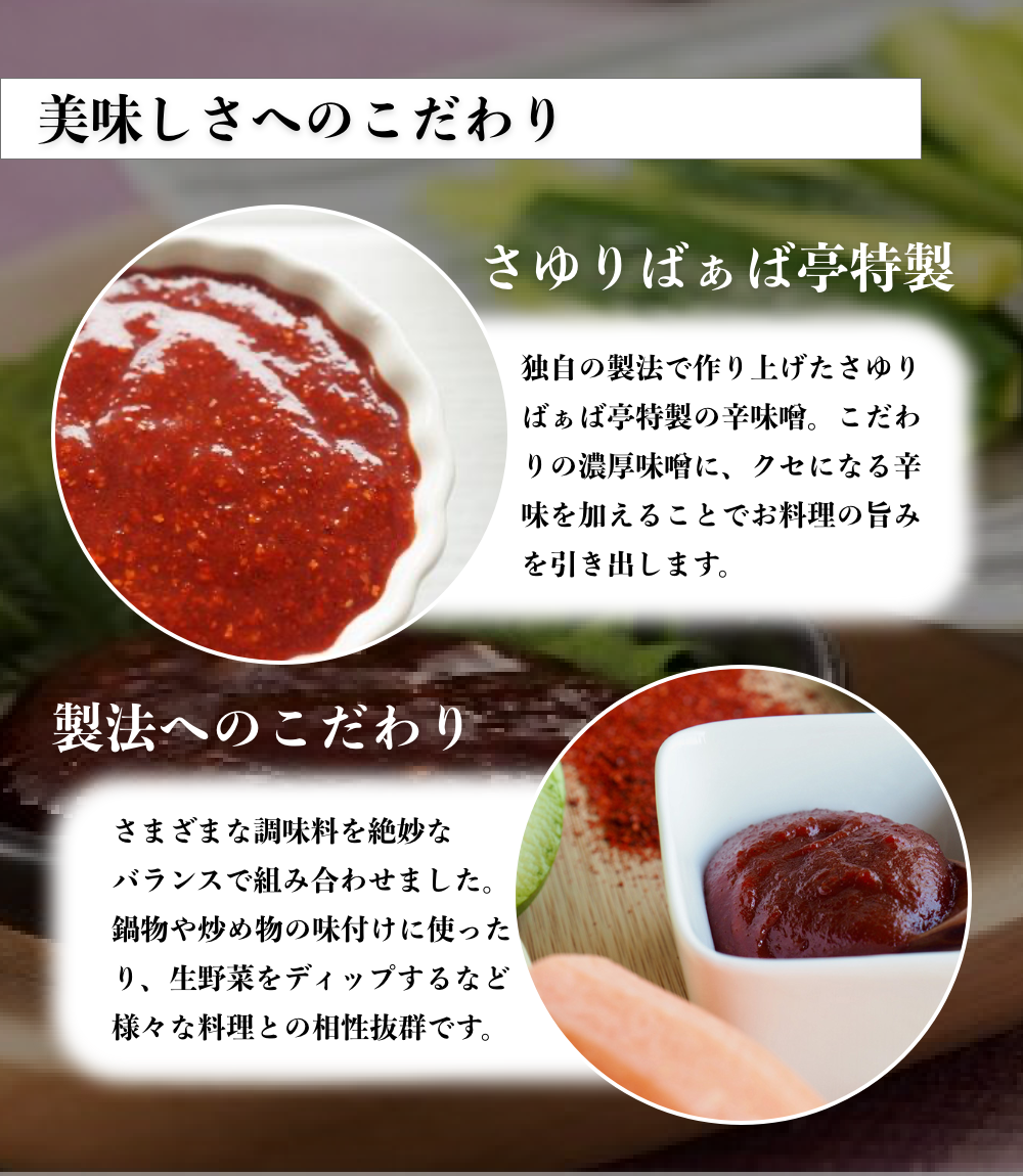 | 原材料 | 調合みそ(大豆を含む)、糖類(砂糖、ぶどう糖果糖液糖)、醤油(小麦を含む)、にんにく、米醸造調味料、食塩、唐辛子、ごま油、いりごま、酵母エキス、しょうが、還元水飴/調味料(アミノ酸)、酒精、増粘剤(加工でんぷん) |